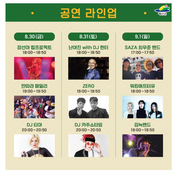 - 8월 30일: 강선아 힙프로젝트, 딴따라 패밀리, DJ 티아