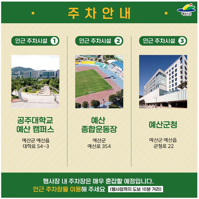 행사장에서 도보로 약 10분 거리에 있는 인근 주차장을 이용하실 수 있습니다.
